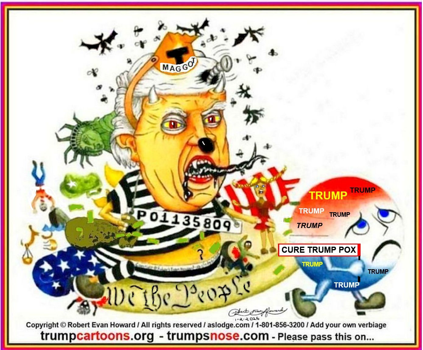 COPPER FOIL CROWN = THE ONLY CROWN HE WILL EVER HAVE. "T" =TRUMP. BATS IN THE BELFRY = LOONY TOONS. HOLE IN THE HEAD = CRAZY. LOOSE SCREW = METNALLY ILL. HORNS = ANTICHRIST. FLYS = DO TO CRAP FOR BRAINS. HORNS = ANTICHRIST. SNAKE EYES = PART OF HIS SLEZZY CHARACTER. FIRE = LIAR, LIAR PANTS ON FIRE. TWISTED BLACK TONGUE = HE SPEWS VITRYOL EVERYWHERE. RAT NOSE = LYING RAT. STATUE OF LIBERTY = IMIGRATION STOPPER. STOMPED ON ARMY HELMET = WHAT HE THINKS OF THE MILITARY VAMPIRE TEETH = SMUCKS AS MUCH MONEY AS HE CAN FROM EVERYONE BLOWN UP BOAT = AGAINST THE LAW. BROOKEN SCALES OF JUSTICE = THINKS OF HIMSELF AS ABOVE THE LAW. P01135809 = HIS BOOKING NUMBER. STOMPING ON THE FLAG, CONSTITUTION, AND PEOPLE OF COLOR = HIS RESPECT FOR THE U.S.A. THE BAG IS TO HOLD ALL THE WOLRDS MONEY = HIS GREED. THE YUNG GIRL IN HIS LEFT HAD = THE FEMALE HE HAS SEXUALLY ASSAULTED. THE WHOLE WARLD TRYING ESCAPE HIS INFLUENCE = HIS EXSTREME EGO... |