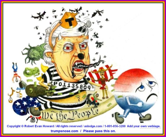 COPPER FOIL CROWN = THE ONLY CROWN HE WILL EVER HAVE. "T" =TRUMP. BATS IN THE BELFRY = LOONY TOONS. HOLE IN THE HEAD = CRAZY. LOOSE SCREW = METNALLY ILL. HORNS = ANTICHRIST. FLYS = DO TO CRAP FOR BRAINS. HORNS = ANTICHRIST. SNAKE EYES = PART OF HIS SLEZZY CHARACTER. FIRE = LIAR, LIAR PANTS ON FIRE. TWISTED BLACK TONGUE = HE SPEWS VITRYOL EVERYWHERE. RAT NOSE = LYING RAT. STATUE OF LIBERTY = IMIGRATION STOPPER. STOMPED ON ARMY HELMET = WHAT HE THINKS OF THE MILITARY VAMPIRE TEETH = SMUCKS AS MUCH MONEY AS HE CAN FROM EVERYONE BLOWN UP BOAT = AGAINST THE LAW. BROOKEN SCALES OF JUSTICE = THINKS OF HIMSELF AS ABOVE THE LAW. P01135809 = HIS BOOKING NUMBER. STOMPING ON THE FLAG, CONSTITUTION, AND PEOPLE OF COLOR = HIS RESPECT FOR THE U.S.A. THE BAG IS TO HOLD ALL THE WOLRDS MONEY = HIS GREED. THE YUNG GIRL IN HIS LEFT HAD = THE FEMALE HE HAS SEXUALLY ASSAULTED. THE WHOLE WARLD TRYING ESCAPE HIS INFLUENCE = HIS EXSTREME EGO... |